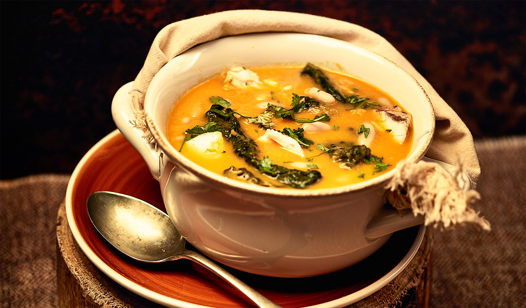 6º Then add the shredded fish, the white beans and the cabbage kale, rectify the seasonings and let it set for 5 minutes. If necessary, add a little more broth.